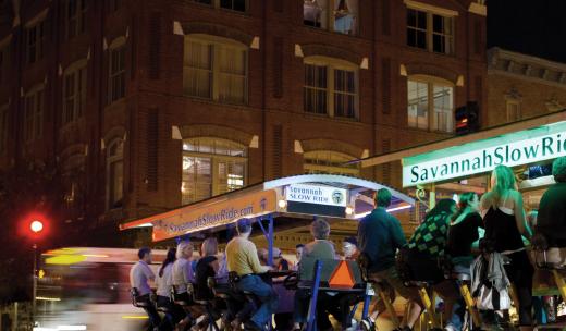 Savannah Slow Ride - Roadtrippers Savannah Slow Ride is the eco-friendly way to see Savannah. Our fifteen person bicycle excursions (you read that right, fifteen people on one bike!) take you through beautiful historic downtown. We offer a variety of routes to entertain bachelor/bachelorette parties, birthdays, graduation celebrations, company or retirement parties, pub-crawls, family outings or just to leave the hustle and ...