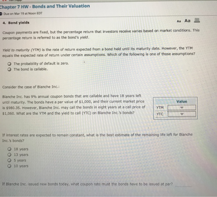 Ytm zero coupon bond. Zero Coupon Bond Calculator - What is the Market Price? - DQYDJ What is a zero coupon bond? A zero coupon bond is a bond which doesn't pay any periodic payments. Instead it has only a face value (value at maturity) and a present value (current value). The entire face value of the bond is paid out at maturity. It is also known as a deep discount bond. Benefits and Drawbacks of Zero Coupon Bonds How to Calculate a Zero Coupon Bond Price - Double Entry Bookkeeping The zero coupon bond price is calculated as follows: n = 3 i = 7% FV = Face value of the bond = 1,000 Zero coupon bond price = FV / (1 + i) n Zero coupon bond price = 1,000 / (1 + 7%) 3 Zero coupon bond price = 816.30 (rounded to 816) The present value of the cash flow from the bond is 816, this is what the investor should be prepared to pay ... Yield to Maturity (YTM) - Overview, Formula, and Importance On this bond, yearly coupons are $150. The coupon rate for the bond is 15% and the bond will reach maturity in 7 years. The formula for determining approximate YTM would look like below: The approximated YTM on the bond is 18.53%. Importance of Yield to Maturity Zero Coupon Bond (Definition, Formula, Examples, Calculations) Zero-Coupon Bond Value = [$1000/ (1+0.08)^10] = $463.19 Thus the Present Value of Zero Coupon Bond with a Yield to maturity of 8% and maturing in 10 years is $463.19. The difference between the current price of the bond, i.e., $463.19, and its Face Value, i.e., $1000, is the amount of compound interest