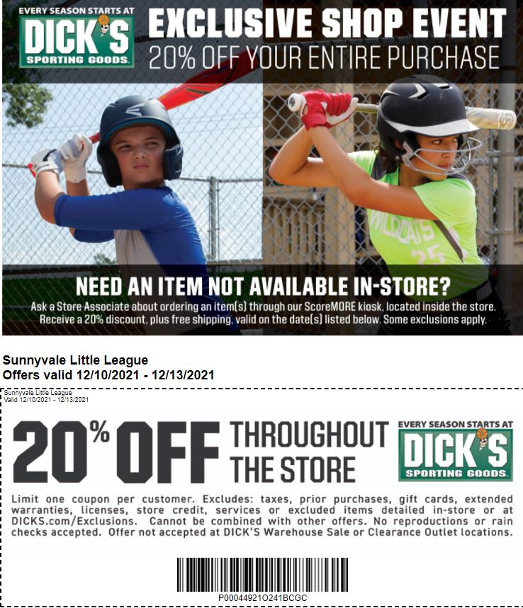 Dick's Sporting Goods Promo Code - wikiHow Coupons Take $20 off all Orders at Dick's Sporting Goods Get coupon TERMS & CONDITIONS $20 Coupon $20 off at Dick's Sporting Goods Get coupon TERMS & CONDITIONS $30 Coupon Get $30 off with this Coupon Code Get coupon TERMS & CONDITIONS The best coupon codes for you